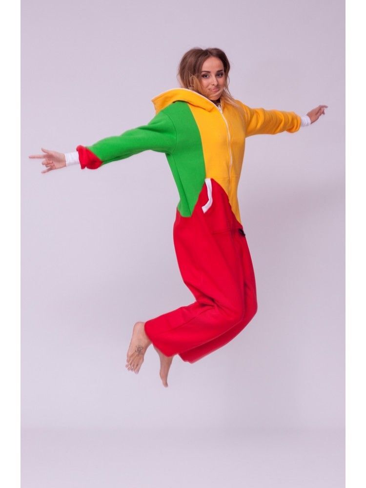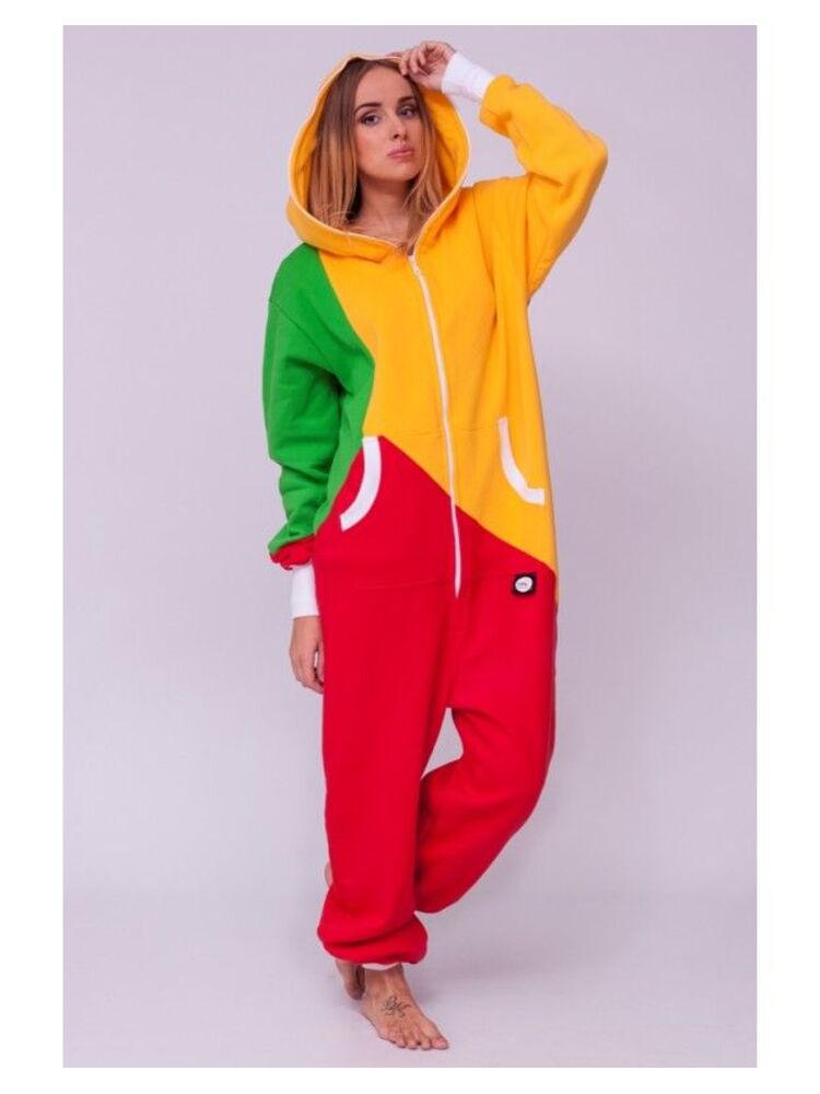 Šiltas trispalvis kombinezonas su Lietuvos vėliavos spalvomis, skirtas tiek vyrams tiek moterims. Kišenės priekyje ir viena nugaroje. Medžiagos vidinė dalis su tankiu pūkeliu, kuris sukuria įpatingą šilumos jausmą ir norą vilkėti kombinezoną nuolat. Sofa Killer kombinezonų modeliai nevaržo judesių, tad puikiai tinka tiek pasyviam tiek aktyviam poilsiui, net miegui. Galite rinktis iš plačios dydžių skalės, o pats rūbas tradiciškai turi būti laisvas, tad kiek didesnis dydis puikiai tiks. Dekoruota Sofa Killer logotipu po kišene priekyje.