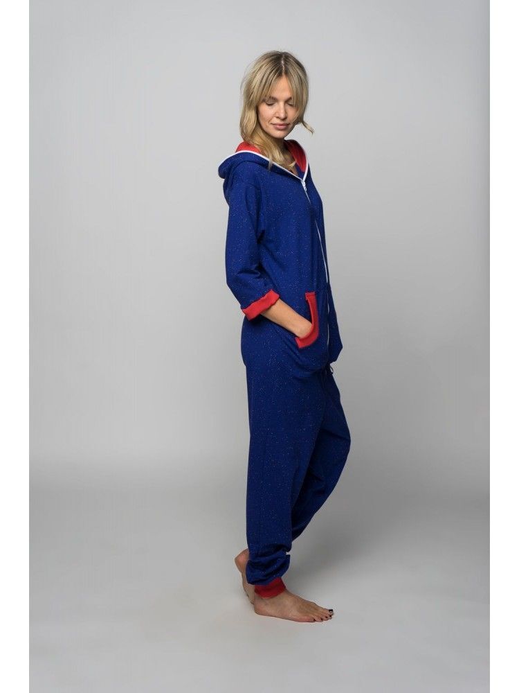 Sofa Killer mėlynas taškuotas kombinezonas trumpintom trijų ketvirčių rankovėm ir raudinais čili atspalvio rankogaliais, skirtas tiek vyrams tiek moterims. Kapišono vidus su kontrastinga salotine medžiaga. Kišenės priekyje. Kombinezono audinys sukuria šilumos jausmą ir norą vilkėti kombinezoną nuolat. Sofa Killer kombinezonų modeliai nevaržo judesių, tad puikiai tinka tiek pasyviam tiek aktyviam poilsiui, net miegui. Galite rinktis iš plačios dydžių skalės, o pats rūbas tradiciškai turi būti laisvas, tad kiek didesnis dydis puikiai tiks. Dekoruota Sofa Killer logotipu po kišene..